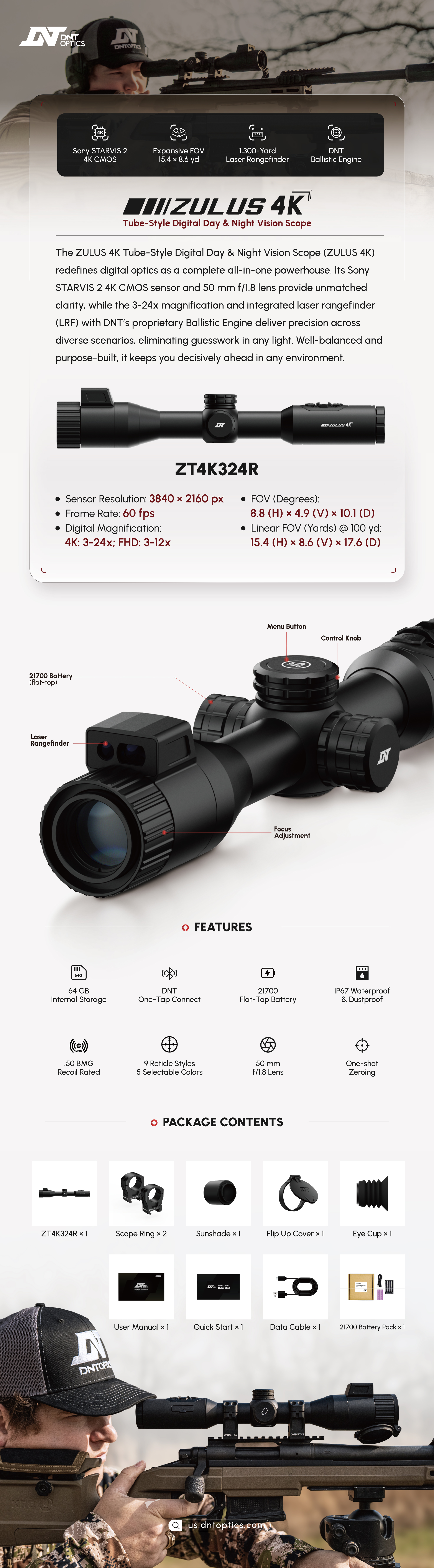 Rated up to .50 BMG recoil, powered by a 21700 flat-top battery, and fully IP67 waterproof and dustproof, the DNT Zulus 4K is engineered to perform reliably in demanding field conditions, making it an exceptional solution for hunting, pest control, and professional shooting applications.